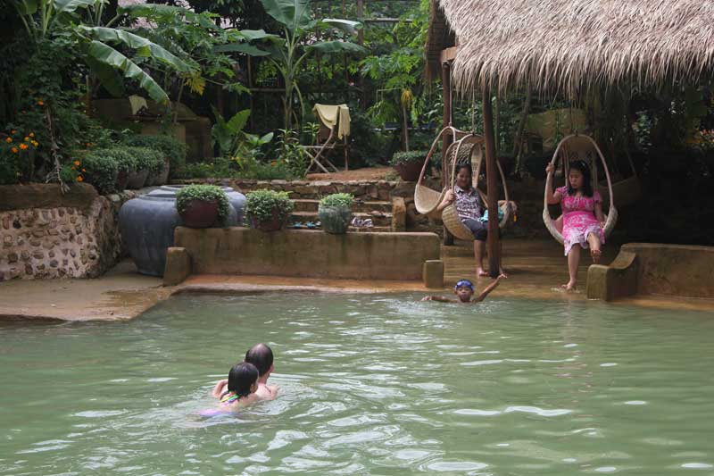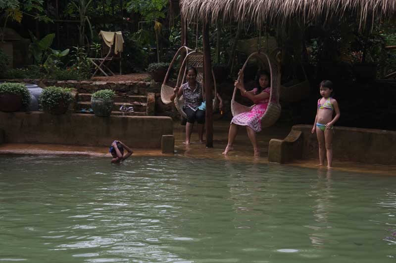 It Raining! It's April, and after a very dry year, we've finally had some rain! The jungle animals are very excited, and we've suddenly seen, and heard, the place spring to life. It's just wonderful! English Classes have begun in earnest. Our staff's well-being is a real priority to us, and as part of their personal and professional development we've decided to take on live-in English teachers on one-month stints. February was a great success, and March is looking good too. WiFi in Jasmine Valley Just a quick heads-up for those who need internet communication. Our satelite service has finally come to an end, but there is no cable available to us as yet, due to our location. We do have a 3G iPad that JV staff use for checking reservations etc. and they'll be happy for you to use it to do quick email checks etc. There are a couple of places around town with reasonable WiFi if you need to head out for an 'internet session' - it'll cost you the price of a coffee and cake or something like that :) If you're really needing to access internet frequently while you're in Cambodia, you can buy a USB dongle from any Metfone store while you're here. They're not expensive, and it means you always have internet.For those smarphone or iPad carriers they also have sim cards with internet access for very reasonable rates. The Springs and the Pool? in February 2013. If you're coming just for the pool, we just want you to know that we've having to do some tweaking at the moment after a very dry 'wet season'. It's pretty green, but swimmable depending on how comfortable you are with it, and there are still nibbling fish for you to enjoy. Being so dry has also meant the springs are very low :( If we get some unseasonal rain, all that will change - we'll keep you informed. Live Music On the Boxing Day 2012 we had a lovely performance from Agnes La Minotte who sang old French songs in the Jasmine Valley Amphitheater under a beautiful full-moon. Christmas Dinner Christmas Dinner was a hoot, with a home-made spit and a 20kg pig, a couple of big Barramundi in the pizza oven as well as a boulliabaise and a stack of huge prawns in butter, garlic and honey. Rather than charging for the meal, we asked our guests to tip what they wanted to pay for Christmas Dinner as a gift to our staff. Monkey Trail Complete A lovely new addition, the Monkey Trail is a 5 to 10 minute stroll through dense jungle complete with a spectacular 'hugging tree' and hammocks for those who feel like a secluded 'swing'. There are often families of monkeys, so walk quietly :) Reading Nook Complete This is a little bit late, but for those familiar with the games room, you'll notice a nice extension down the back. It's a reading nook that helps keep the rain out of the games area, while providing a lovely space for reading and relaxing. Butterfly Farm Next Door Our new neighbours. The Kep Butterfly Farm. Opening late 2012. Another nice thing to do in the Valley.