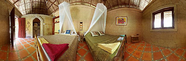 Room 1 is 7x4m mud brick bungalow with a thatched roof. It's a large space with an ensuite bathroom and a king-sized bed. It also has a king-sized single bed. This bungalow sits on the rainy season creek, which should be flowing during the wet season. We're currently preparing for the wet season by lanscaping the creek and creating swimming, or sitting pools in front of bungalows 1 to 5. Deep in the valley, your view is an intimate view of the jungle and mountain. For an interactive quicktime image of Room 1 click here, otherwise, there's a quick video tour below.