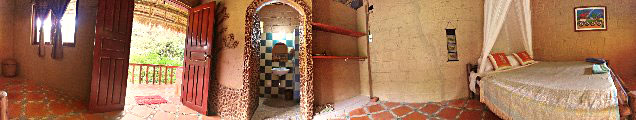 Room 4 is a 6x4m mud brick bungalow with a thatched roof. It's roomy, with an ensuite bathroom and a double bed. This bungalow sits on the rainy season creek, which should be flowing during the wet season. We're currently preparing for the wet season by lanscaping the creek and creating swimming, or sitting pools in front of bungalows 1 to 5. Deep in the valley, your view is an intimate view of the jungle and mountain. For an interactive quicktime image of Room 4 click here, otherwise, there's a quick video tour below.