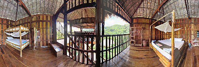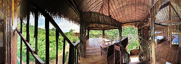 Room 8 is a premium room. It has a large downstairs garden bathroom, a big bedroom with a king-sized bed and two king-sized singles. It also has a large semi-detatched terrace with the most amazing views over islands to Vietnam and the panorama of jungle that Jasmine Valley offers.